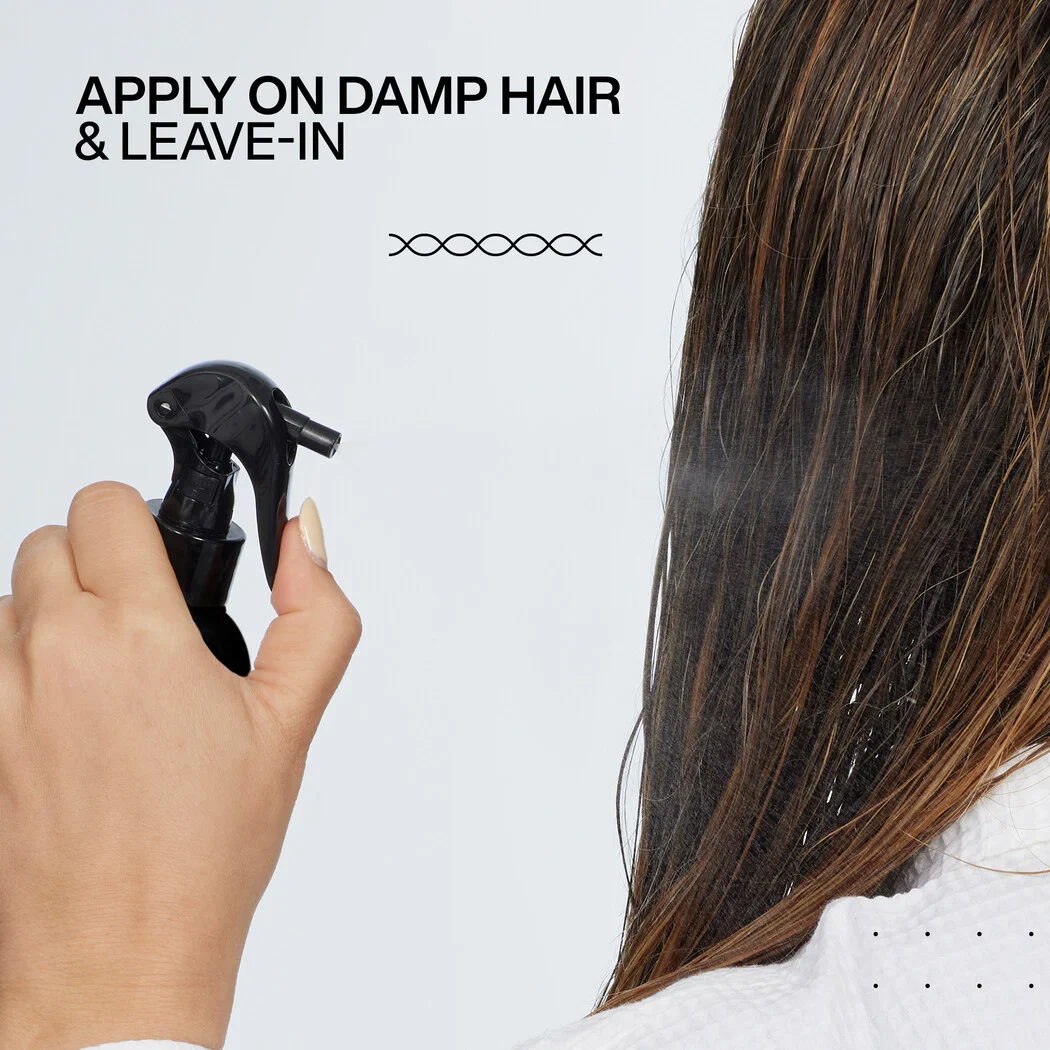 Hapi 1: Pas larjes me Acidic Color Gloss Shampoo, aplikimit të Activated Glass Gloss Treatment dhe përdorimit të Conditioner, aplikoni Acidic Color Gloss Heat Protection Leave-In Treatment në flokë të pastër dhe të tharë me peshqir.